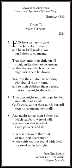 Mr. Metcalfe states: ‘I knew within me that this would take years of my life, day and night, seven days a week, twelve months in a year. And so it proved. From 1979 to 1984, without a day’s remission, I laboured through this work on the Psalms, latterly addressing the beginning of the Songs and Hymns from 1984 to 1986. By the end of this period, that is, from 1979 to 1986 inclusive, the grace and providence of God and the Father, the teaching and leading of the Son, and the inspiration and guidance of the Holy Ghost enabled me to conclude the Psalms, Hymns, and Spiritual Songs.’